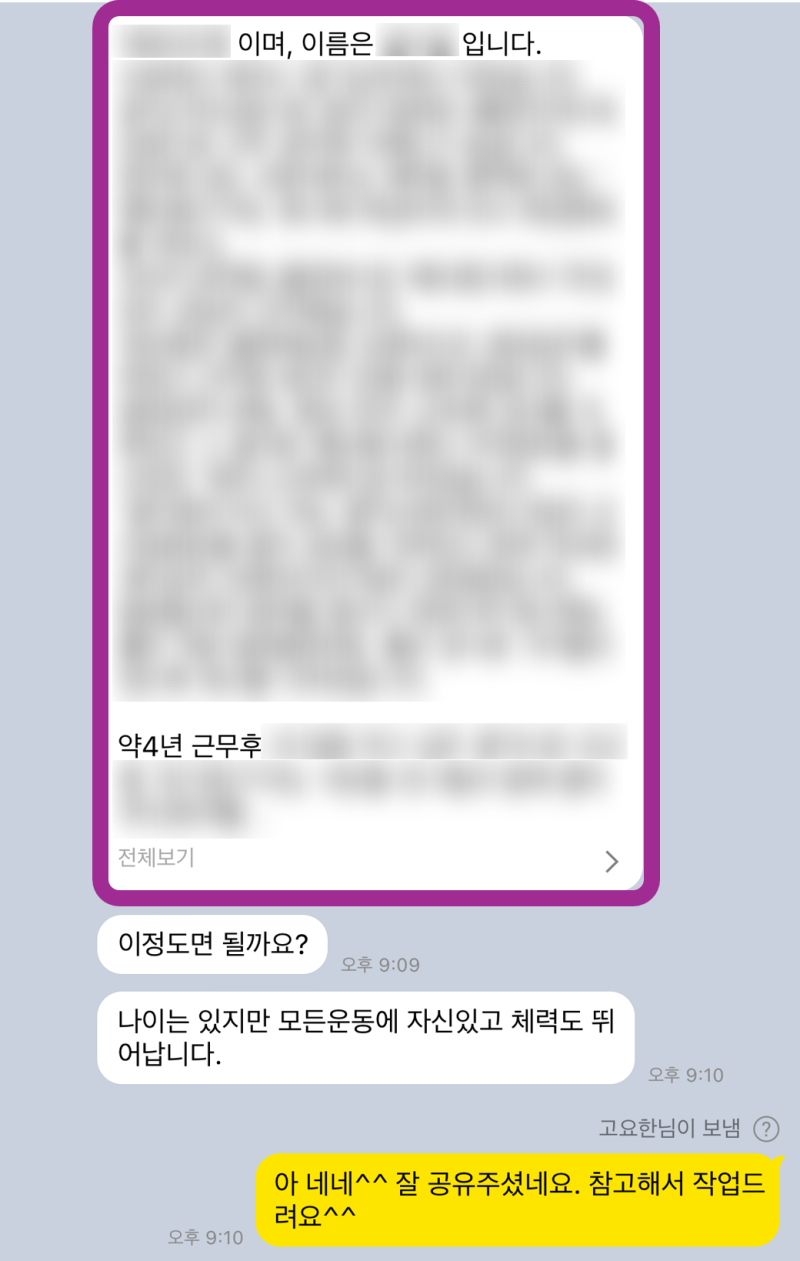 - >> 문의 및 상담 신청: 지원 직무, 제출 기한, 지원자님의 상황 등 상세하게 파악! 🗣️