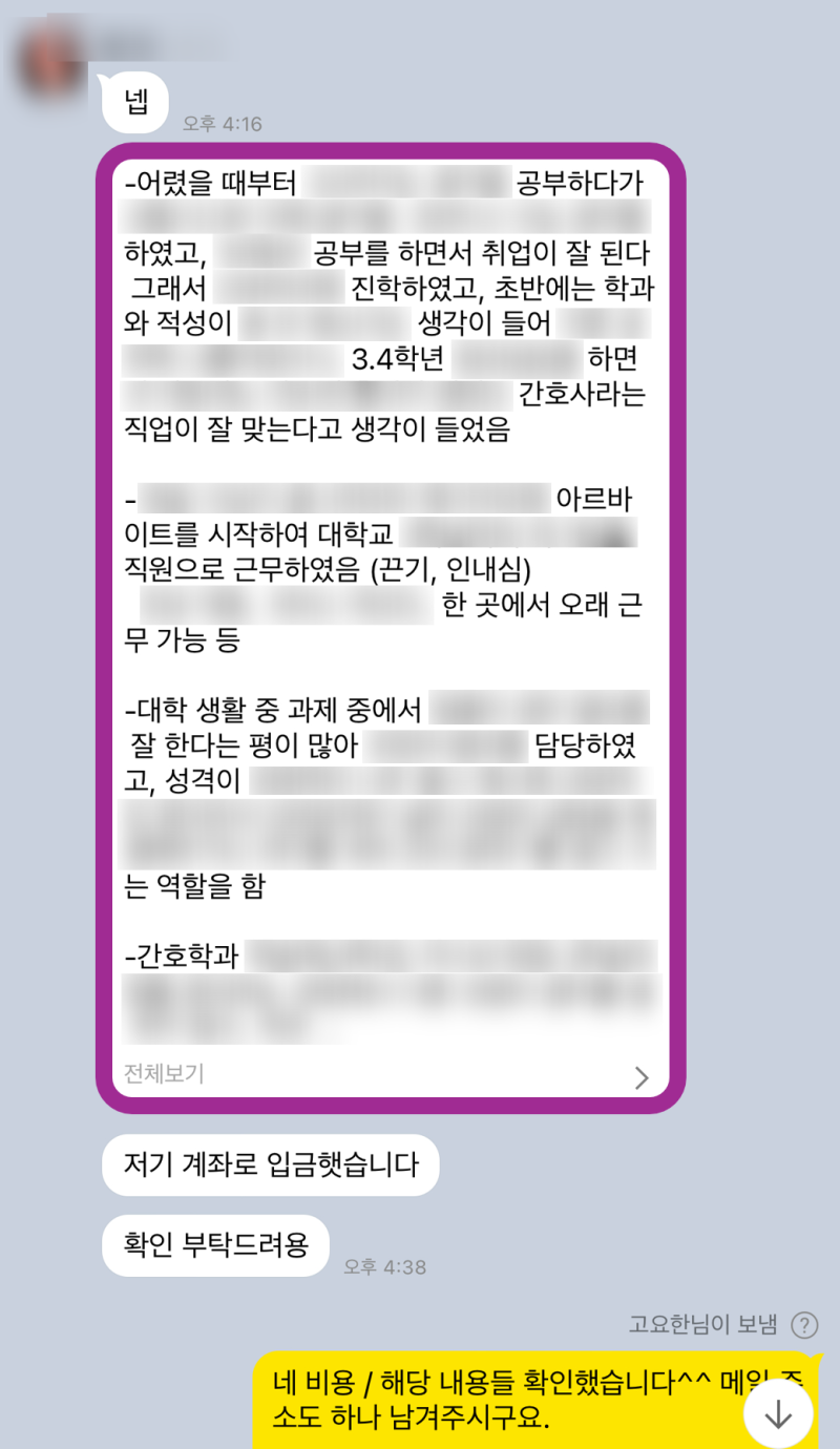 - >> 피드백 및 수정: 지원자님께 초안 전달 후 꼼꼼한 피드백을 통해 내용 수정 및 보완 (2회까지 진행)