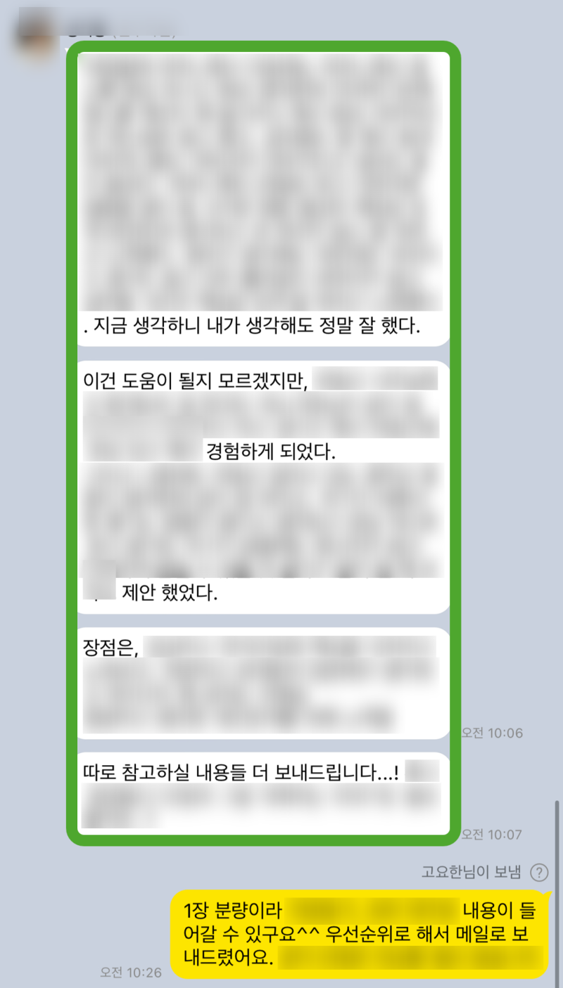 문항별 요구사항을 정확히 충족하는지, 가독성은 좋은지, 오탈자는 없는지 꼼꼼하게 검토하여 완벽한 자소서를 완성했습니다.