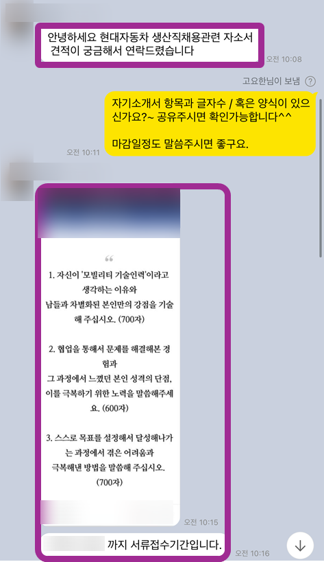 현대자동차 생산직 자소서 대필, 합격 자기소개서 첨삭 후기! 대기업 전문가는 다르죠?