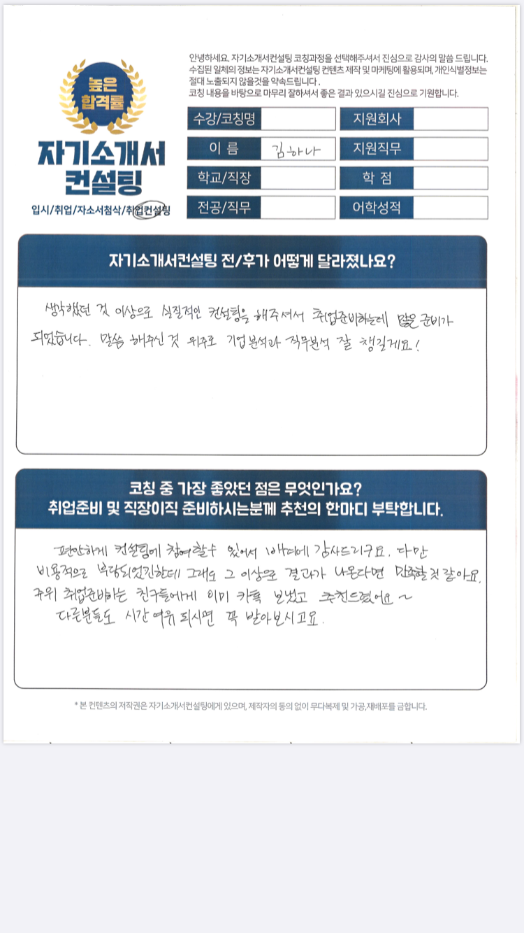 코람코자산신탁 합격 자소서 비법 공개! 1:1 첨삭 컨설팅 리얼 후기