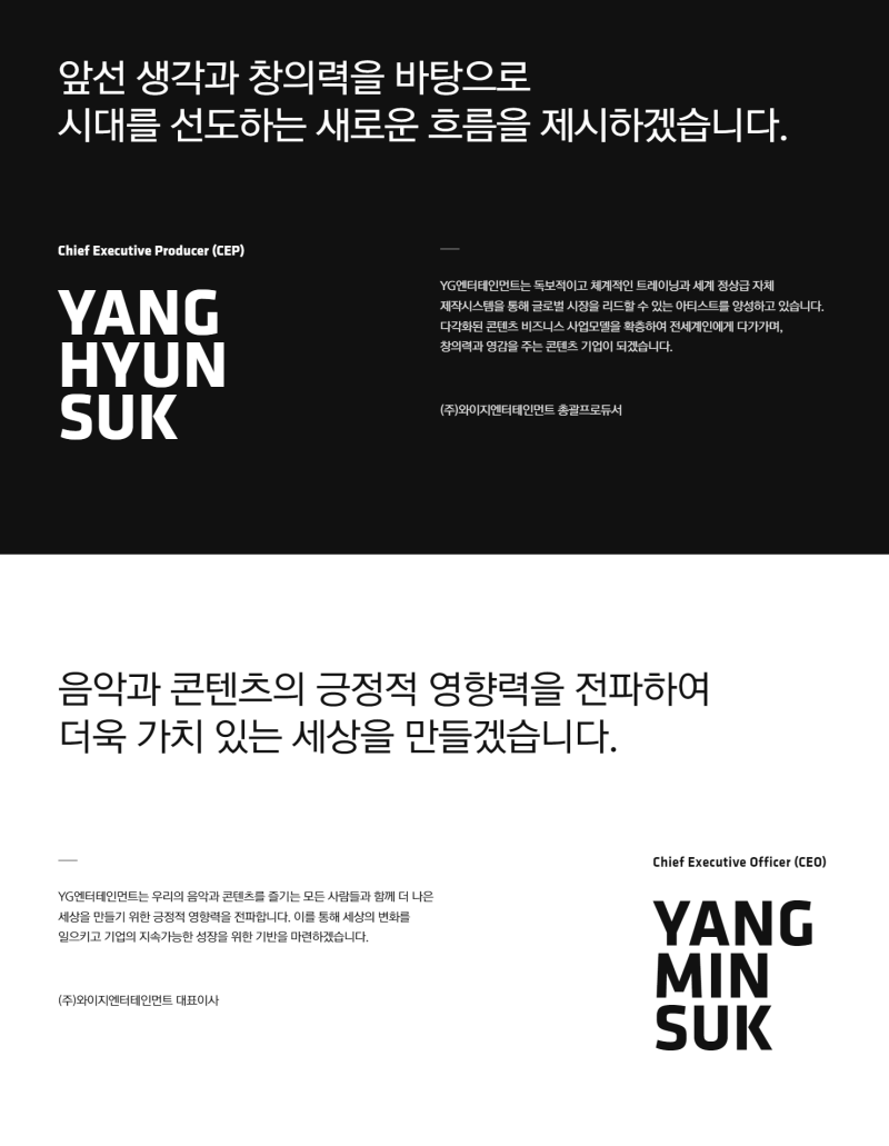 핵심가치: HIPHOP, ARTISTY, TRENDY. 이 세 가지 가치는 YG의 음악적 뿌리와 창의적인 아티스트 정신, 그리고 시대의 흐름을 읽고 선도하는 능력을 나타냅니다.